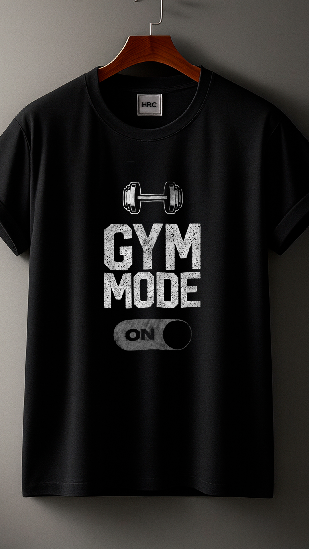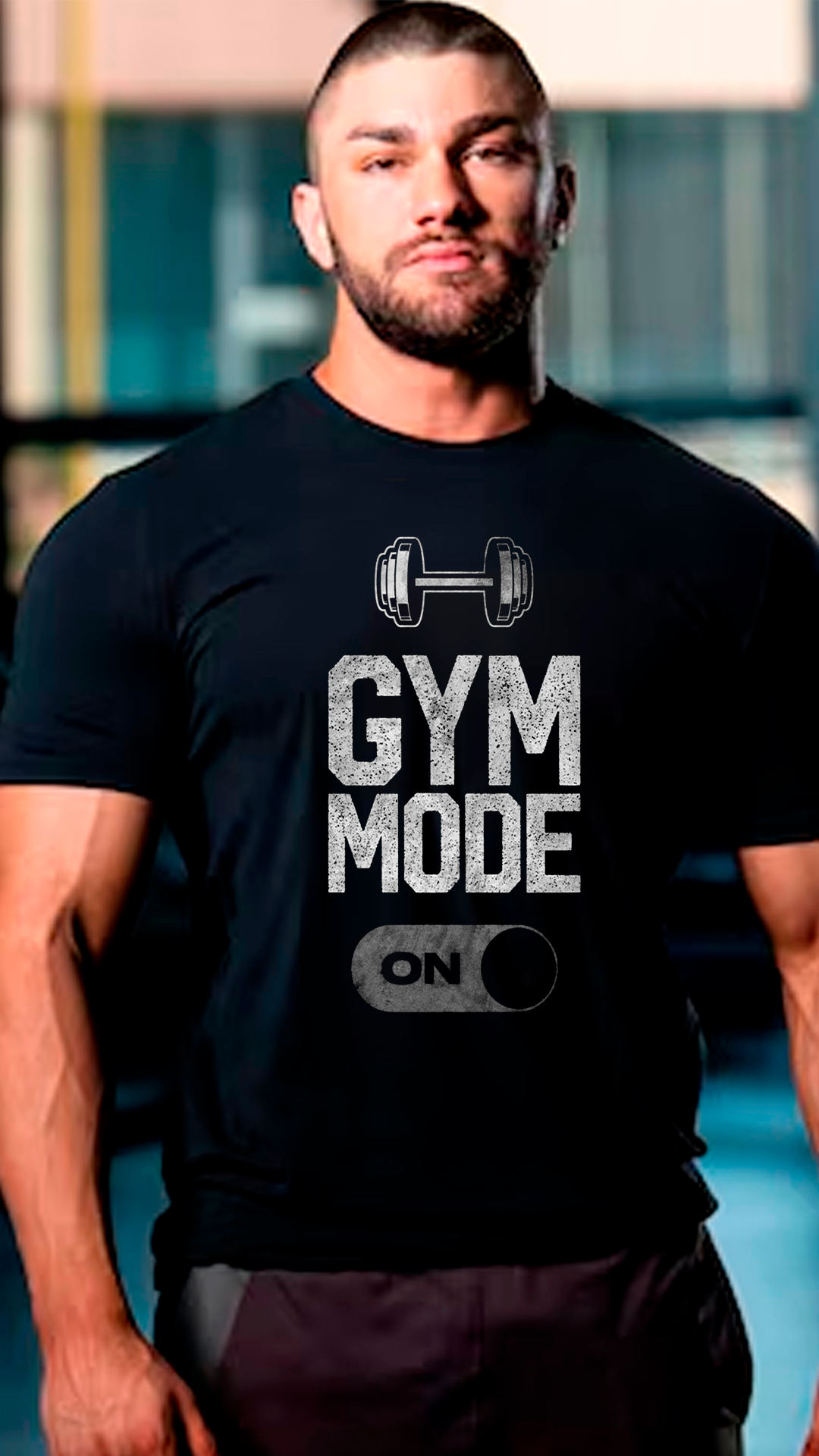 Remera negra de estilo deportivo con diseño motivacional ideal para amantes del fitness y el entrenamiento. En el centro presenta un estampado llamativo con una mancuerna en la parte superior y la frase “GYM MODE” en tipografía grande con efecto desgastado, que transmite fuerza y actitud. Debajo, un interruptor gráfico con la palabra “ON” simboliza estar activado y listo para entrenar.