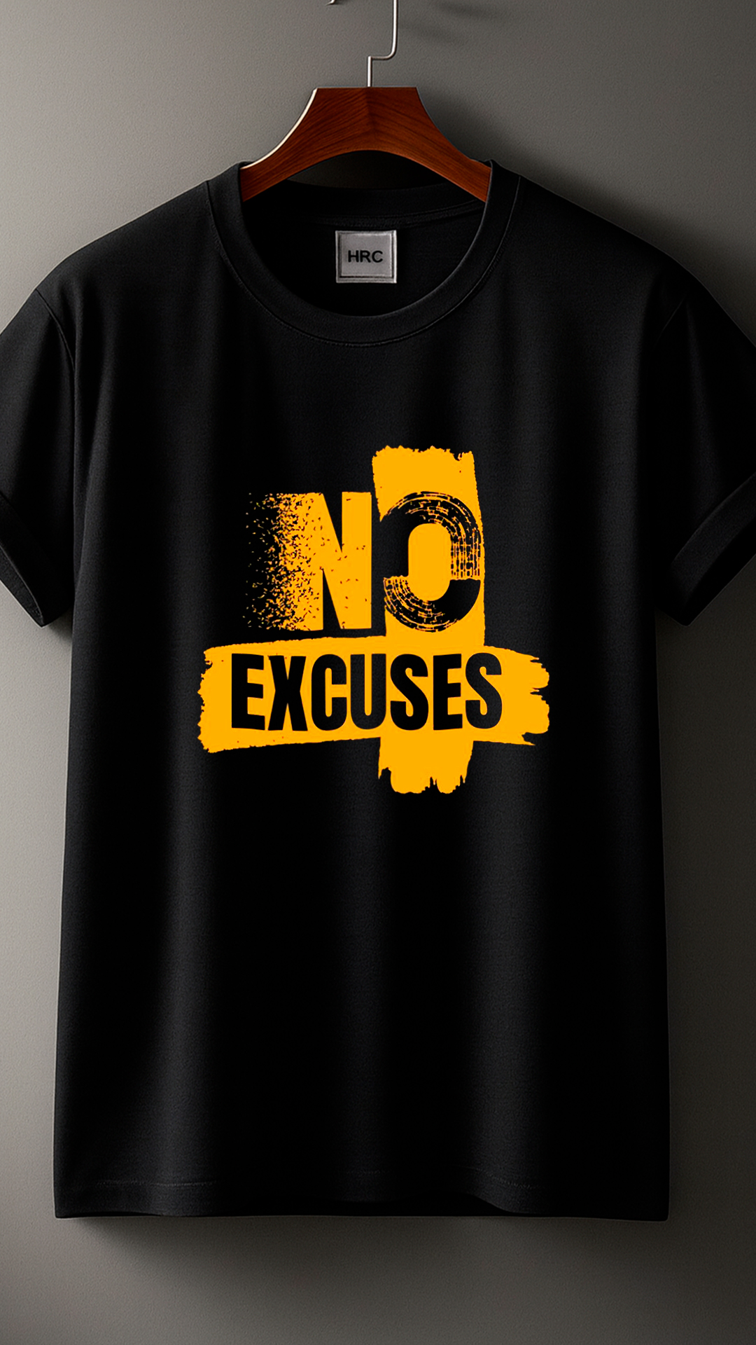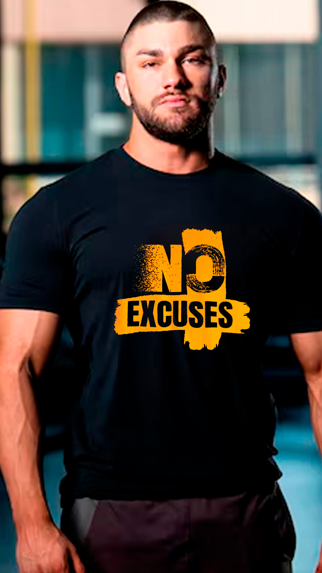Remera negra de estilo deportivo con un diseño motivacional fuerte y moderno, pensada para quienes viven el entrenamiento con disciplina y determinación. En el centro presenta un estampado llamativo con la frase “NO EXCUSES” en color amarillo intenso, acompañado de un efecto gráfico desgastado que le da un look urbano y enérgico.